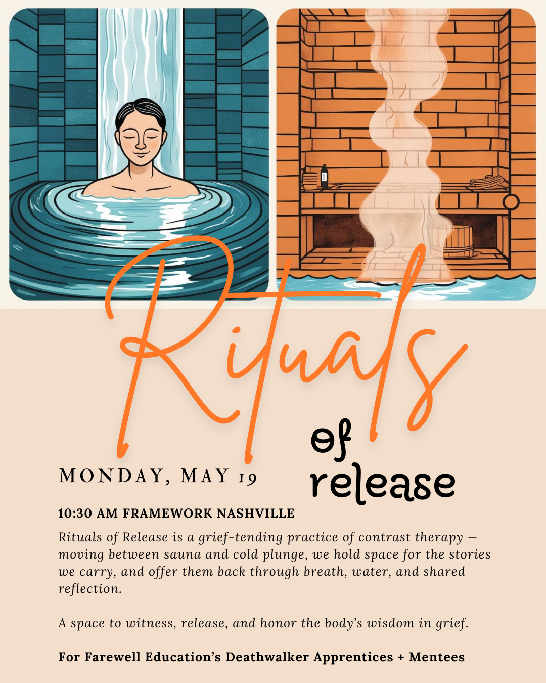 Last week, we gathered at Framework for a ritual of release — sauna, cold plunge, and soft silence. It was planned for a couple weeks but happened to come literally the hour after Roxane's body was collected by the crematory. I left the client's home and went into the community of apprentices who shared the experience of serving this family. Together, we processed, vented, cried, laughed, and began the work of moving through the grief that is inherent in this service.